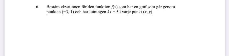hur ska man tänka här ? Ska jag göra om 4x-5 som en primitiv funktion o sedan sätta in -3 och sedan köra y=kx+m eller hur ska man tänka ?
