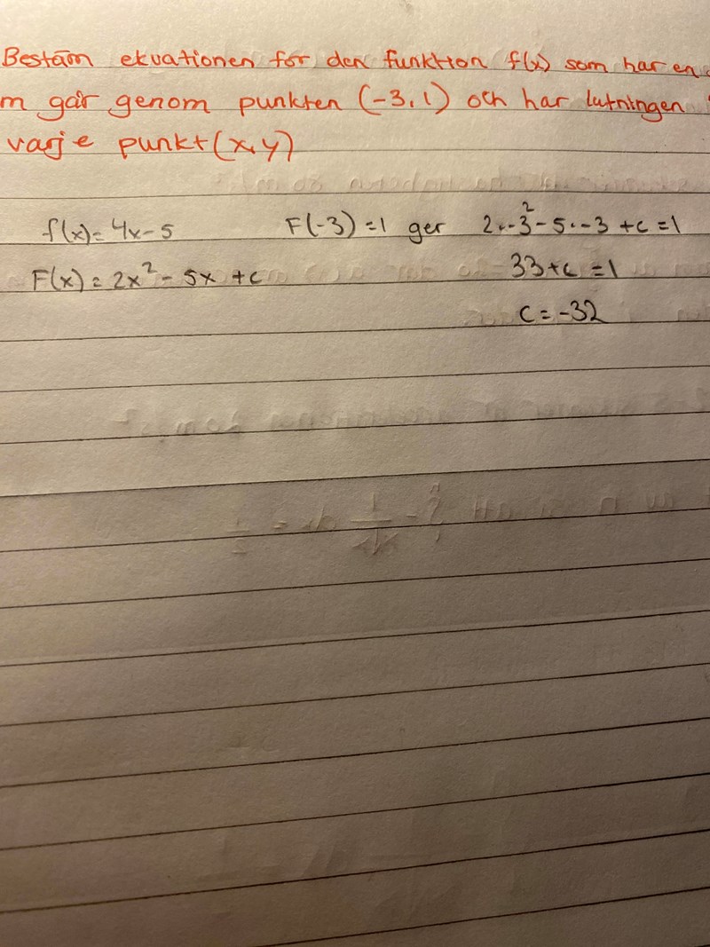 Du ska hitta en primitiv funktion till 4x - 5, vi kan kalla den F(x), så att F(-3) = 1