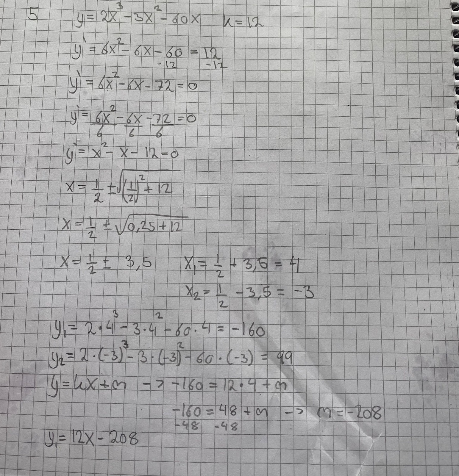 Bestäm ekvationen för den/de tangent/tangenter till kurvan: 𝑦 = 2𝑥3 − 3𝑥2 − 60𝑥 som har k-värdet 12.
