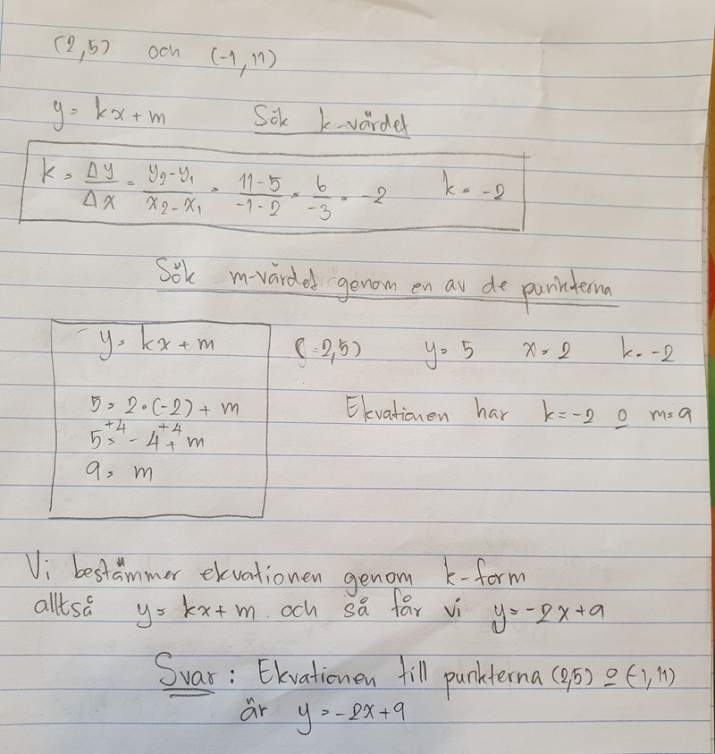 Du vet att räta linjens ekvation kan skrivas y=kx+m. Välj den ena punkten, t ex (2,5). Om du sätter in k, x och y i formeln y=kx+m får du . Vad är m?