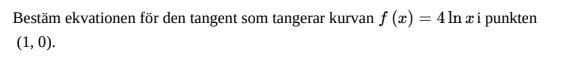 Bestäm ekvationen för den tangent som tangerar kurvan i punkten (1, 0).