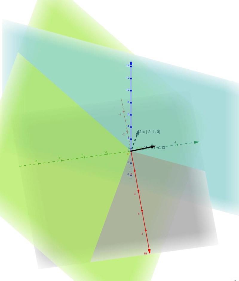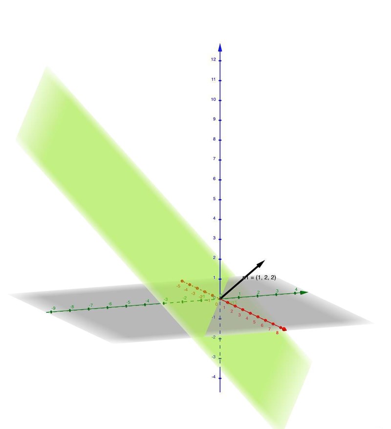 Om vi börjar med det som är givet så finns ett plan som beskrivs av x+2y+2z=0. Som du själv förklarat har det en normal som är (1,2,2) -- vi kan visualisera den typ såhär (här är x-axeln röd, y-axeln grön, och z-axeln blå):