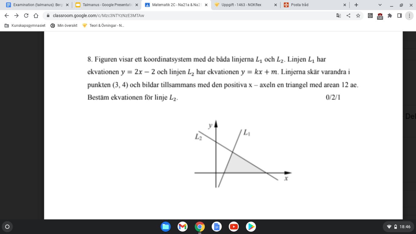 Hej, jag behöver hjälp med den här frågan. Jag vet hur jag ska lösa ut ekvationen för linje L2 men jag förstår inte vad jag har för användning av "bildar tillsammans med den positiva x-axeln en triangel med arean 12.ae".