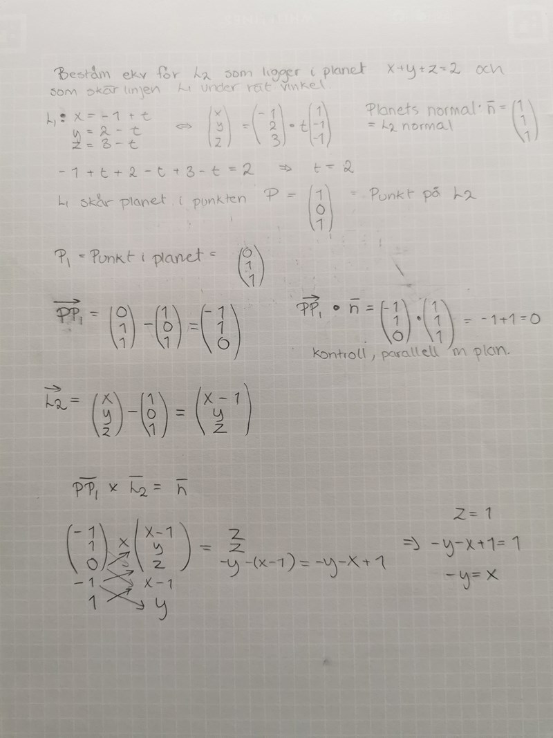 Uppgiften lyder som nedan, jag söker riktningsvektorn för L2, jag tänker att om jag har två vektorer i planet : pp1 och l2, tar kryssprodukten mellan dem = planets normal, där (x y z) är min sökta riktningvektor.