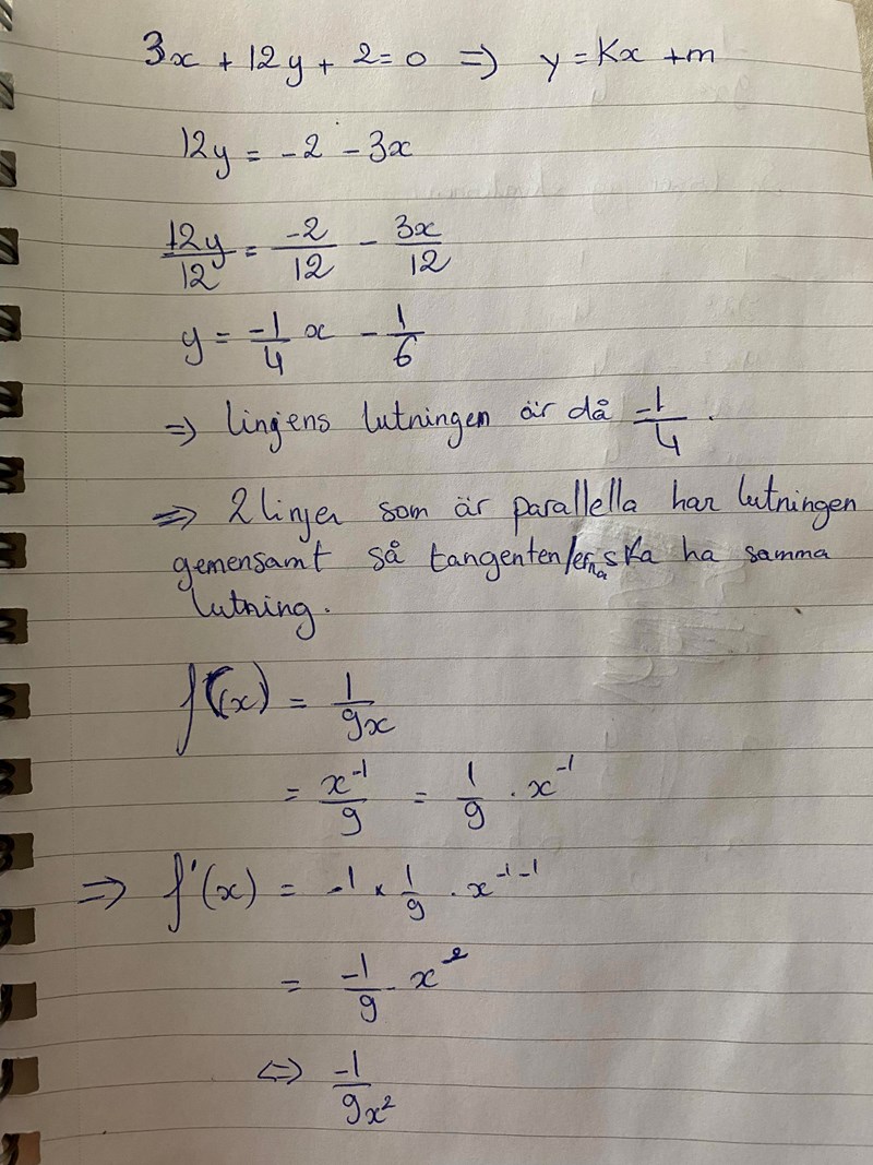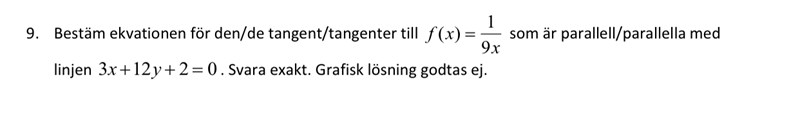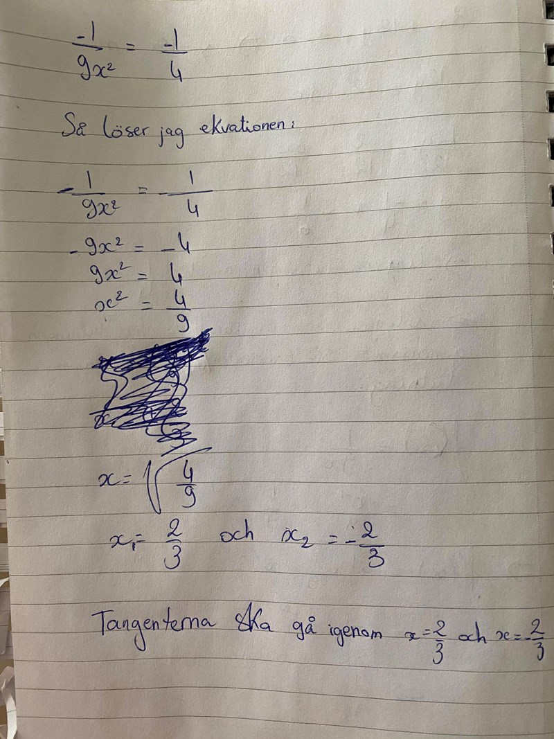 Utmärkt! Tangenterna ska alltså ha lutning -1/4 och skära grafen där x = 2/3 eller -2/3. Vilket y-värde har f(x) då x = 2/3? Vilken rätt linje har lutningen -1/4 och skär denna punkt? :)