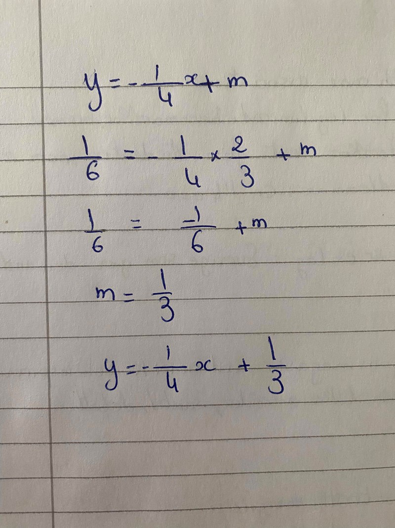 Du har en linje med lutningen -1/4 som går igenom punkten (2/3; 1/6). Sätt in dessa värden i räta linjens ekvation, så får du ut ett m-värde. Då har du ena linjens ekvation sedan. :)