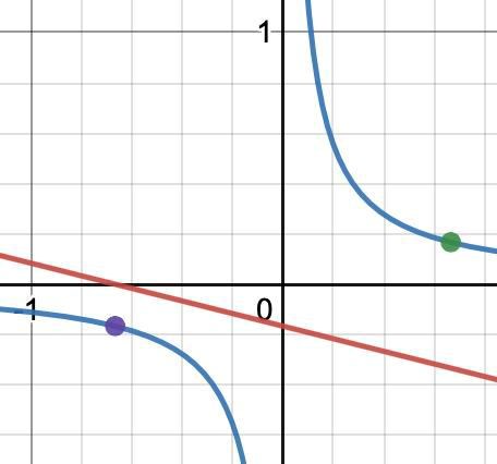 Nu letar vi efter den lila och den gröna punkten. Vilka värden har dem? Deras x-värden är -2/3 respektive 2/3. :)