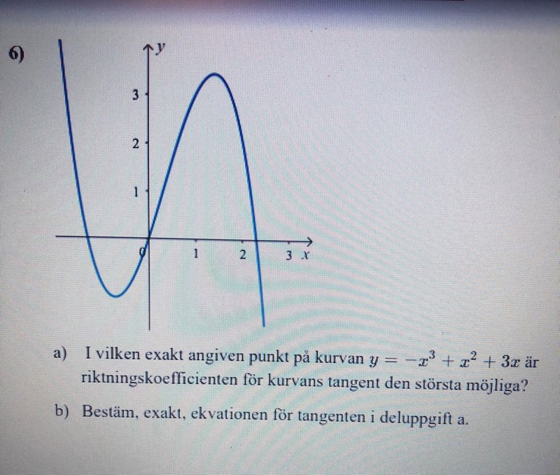 Om jag inte har helt fel borde y''=0 ge dig x-värdet där tangentens lutning är som störst. Sen deriverar du den vanliga funktionen för att få den allmänna tangentens lutning y'=k och sätter in x-värdet som du fick fram i a).