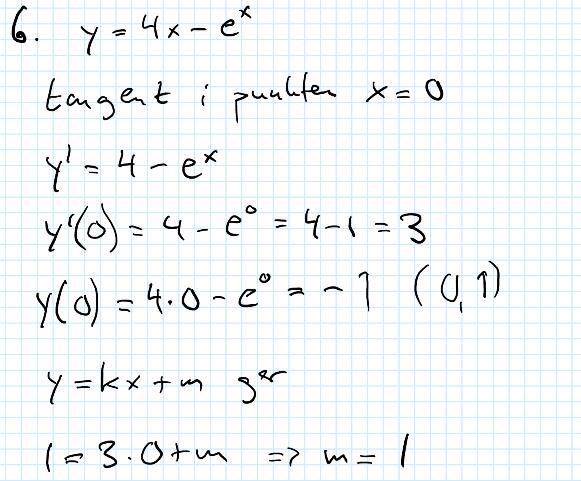 "Bestäm ekvationen för tangenten till kurvan 𝑦=4𝑥−𝑒^x i punkten 𝑥=0. "