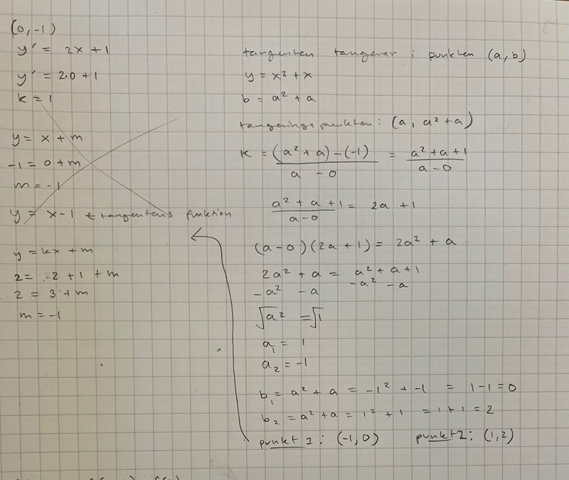 Den andra tangenten går genom punkterna (0,-1) och (1,2), kan du ta reda på dess ekvation?