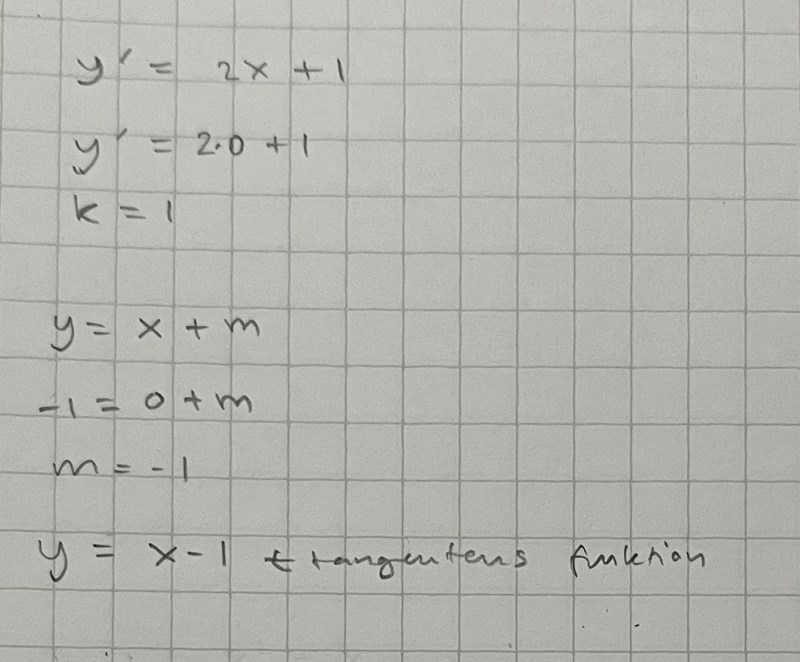 Jag förstår det du har gjort och har kommit fram till vad a och b är, men jag förstår inte hur jag ska gå vidare för att ta reda på tangentens ekvation. Jag har kommit på att m-värdet är -1 och k = 2x + 1 så då tänker jag att tangentens ekvation är y = (2x+1)x - 1 men det är enligt facit inkorrekt. Vad är det för fel jag gör? Har jag missuppfattat något?
