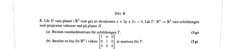 Om du väljer egenvektorerna med egenvärde 1 som första och andra basvektor och egenvektorn med egenvärde 0 som tredje basvektor så blir T:s matris relativt denna bas den sökta diagonalmatrisen. Så nu är b) löst.