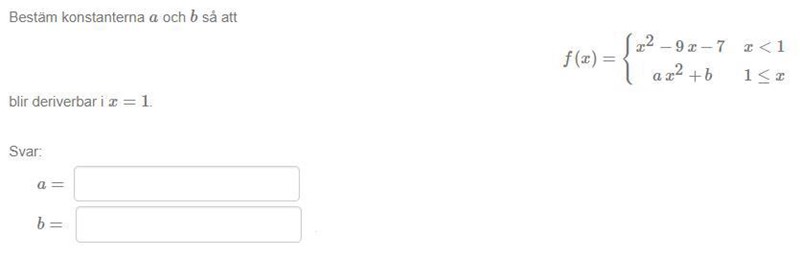 Smaragdalena skrev :Sätt in värdena i ekvationen och kolla om f(1) enligt andra raden ger samma värde som f(1) enligt första raden har som gränsvärde. Om det stämmer, kan du derivera de båda funktionerna och kolla motsvarande. Om det inte stämmer, betyder det att du har räknat fel.