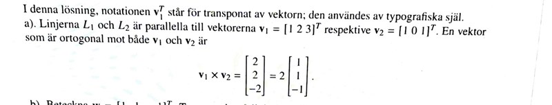I facit så fick de bara 2(1,1,-1) vilket är väl samma som (2,2,-2) i a) uppgiften men de normerade inte för att få enhetsvektorn som efterfrågades. Ska man inte göra det när det frågas om enhetsvektor som i detta fall är normerade normalvektorn till v1 och v2?