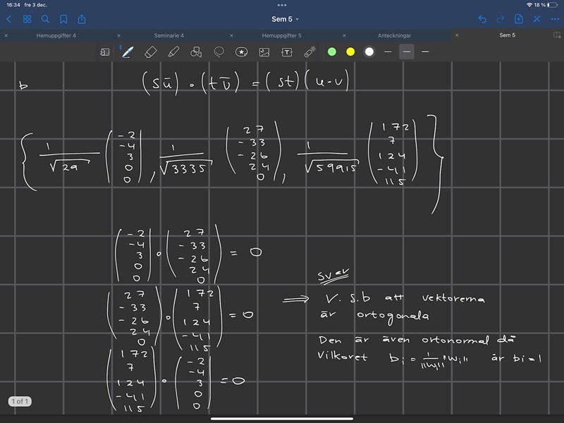 Ett litet tillägg på b), jag ser inte om du verifierat att längden av vektorerna är 1, eftersom det är ett av kriterierna för ortonormala basvektorer så kan det vara bra att ha med, att bara kolla att basvektorerna är vinkelräta så verifierar man om de är ortogonala. Du kan dock ha gjort det bara att det är svårt att se :)