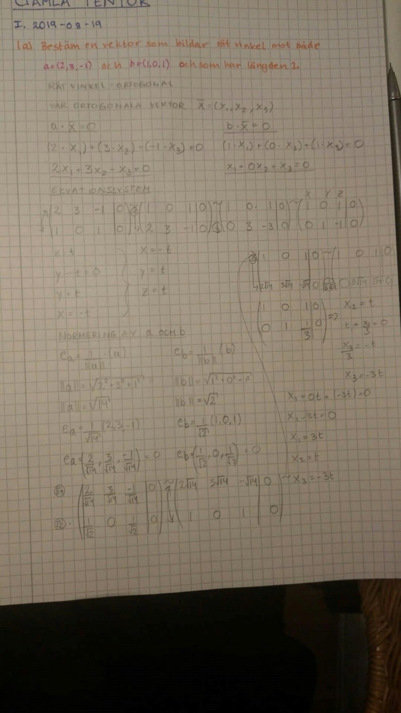 "Bestäm en vektor som bildar rät vinkel mot både a=(2,3,-1) och b=(1,0,1) och som har längden 1.