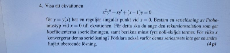 Bestäm en serielösning av frobeniustyp vid x=0 , ange rekursionsrelation och 4 nollskilda termer.