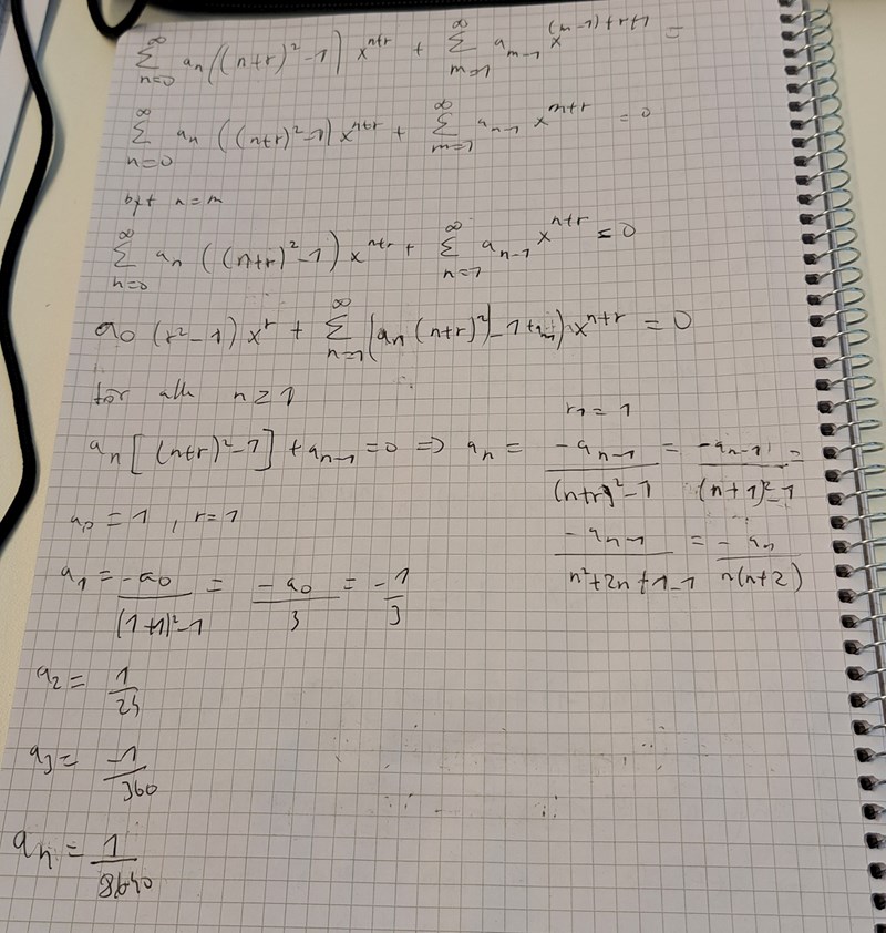 Jag körde fast på hur jag ska bestämma lösning med r=1 och r=-1 samt för vilka x som den konvergerar? Ska man använda rottestet? Hur förklarar man serieansats inte ger en andra linjärt oberoende lösning? En annan sak jag undrar över är varför a_0 inte kan räknas som första termen bland de fyra nollskilda?
