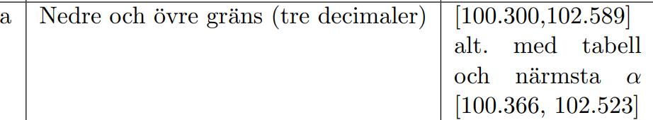 Hej! Jag försöker lösa a)-uppgiften men funderar på om jag gjort rätt? MItt konfidensintervall är ganska nära det i facit men det är inte exakt samma. Jag har dock använt alpha/2=0,025 då det inte fanns för 0,02, dock skrev de också ett intervall för det närmaste tabellvärdet för alhpha/2 och det stämmer inte överrens med mitt intervall så blir osäker på om jag gjort rätt?