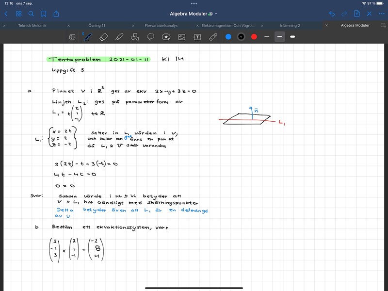 Vi vet att linjen ligger i planet, ty L är ett delrum av V. Så våran tanke är om man kryssar linjens vektor, med normalvektorn får man den andra vektorn som spänner upp planet. Detta gör att ett ekvationssystem vars lösningmäng är L blir