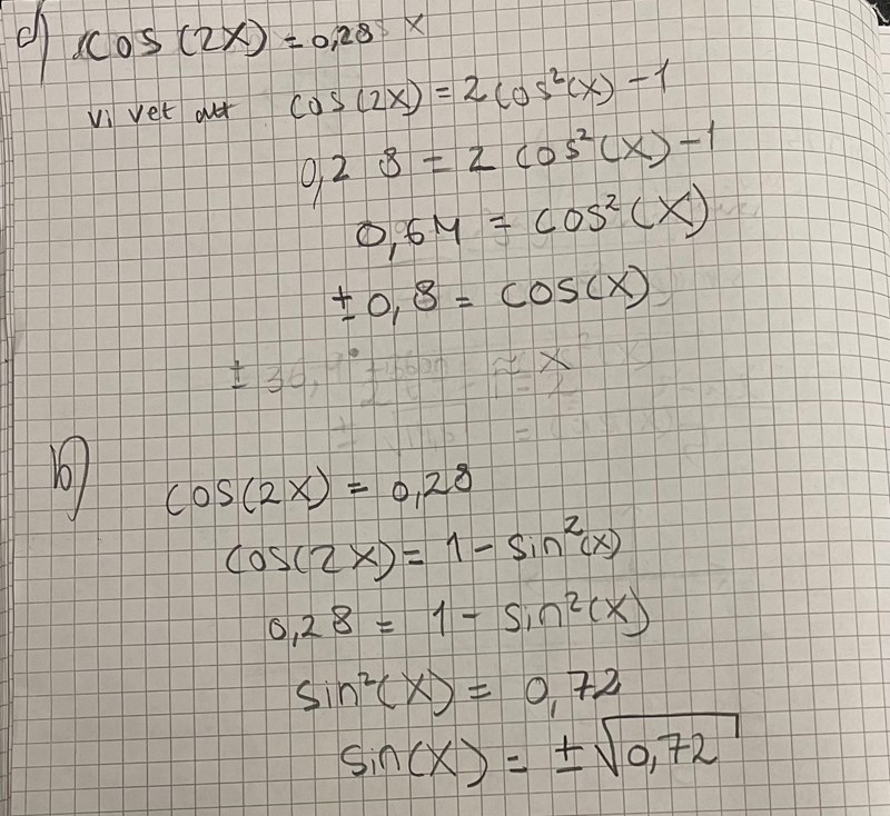 är cos (2x) = 1 - sin2x?