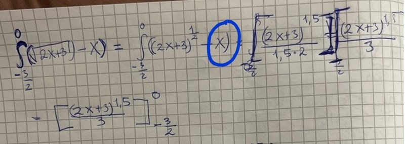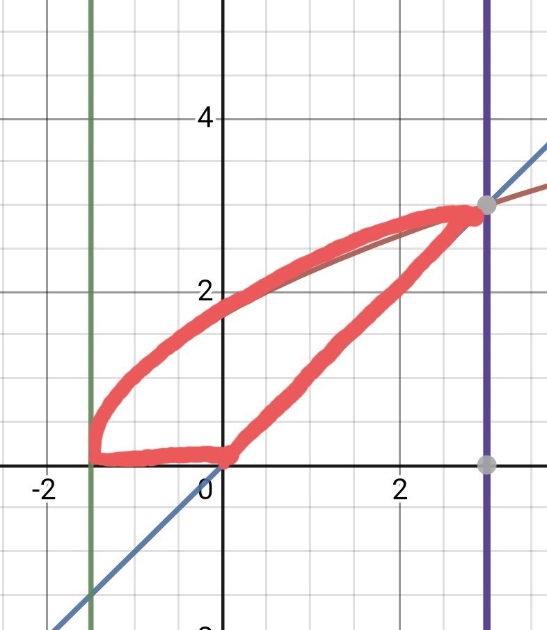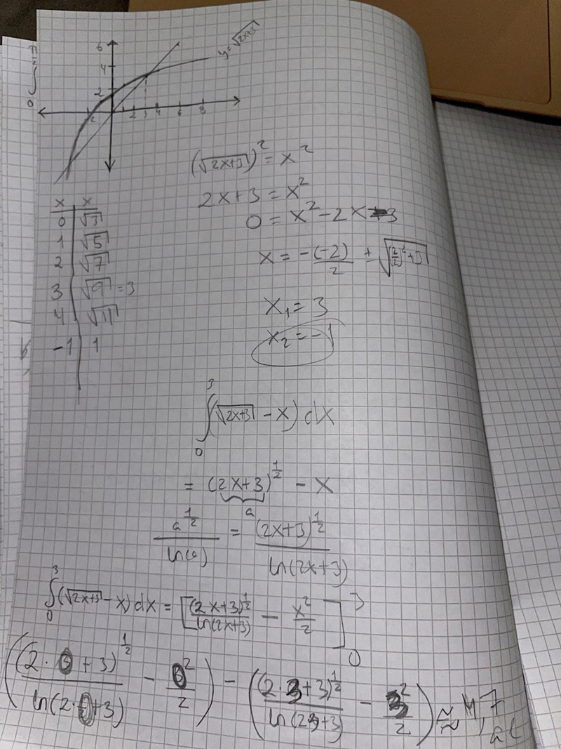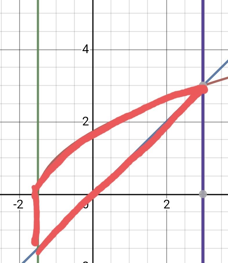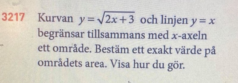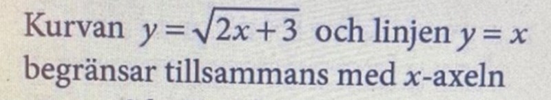 ska man inte bara ta integralen mellan x=-2 till x=3 där man tar överfunktionen y=sqrt(2x+3) minus undre funktionen y=x ?