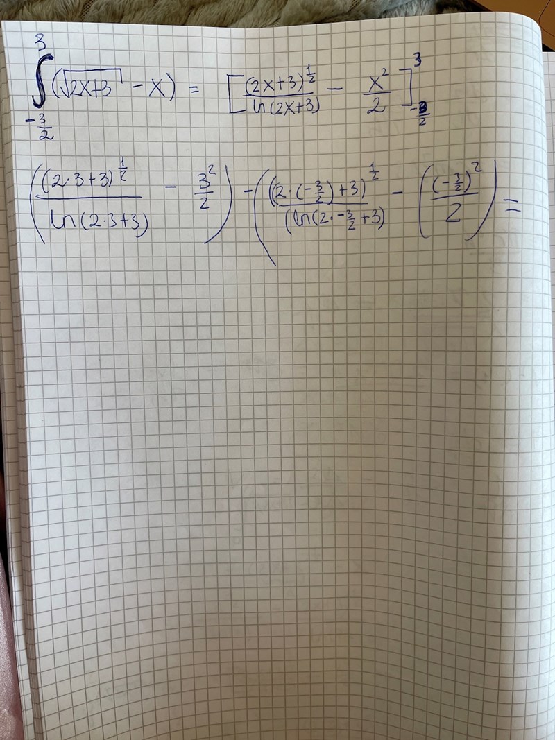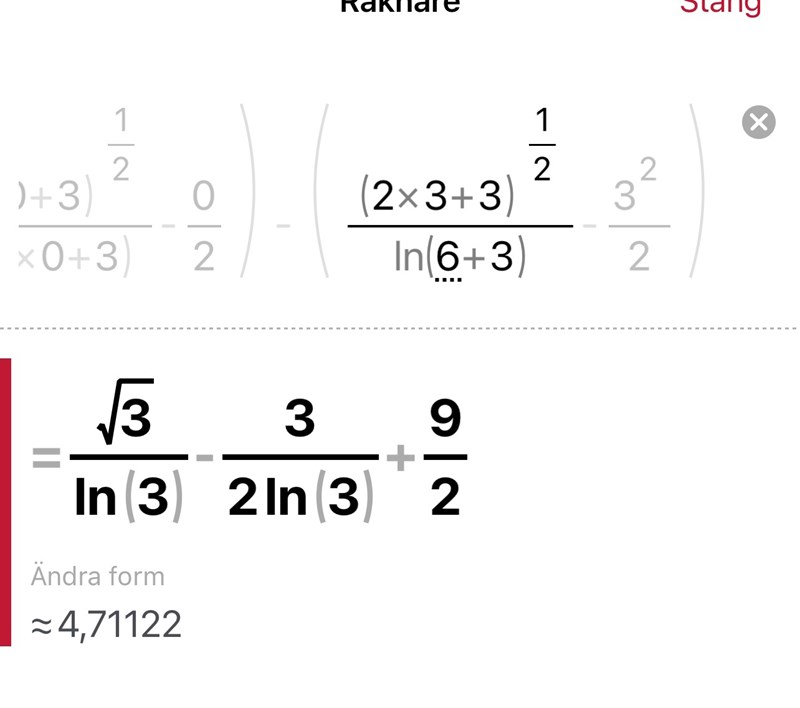 Varför får jag inte fram den efterfrågade arean? Om jag gör så här? y=sqrt(2x+3) är ju hela tiden övre funktionen och y=x är undre funktionen i intervallet x= -3/2 och x=3