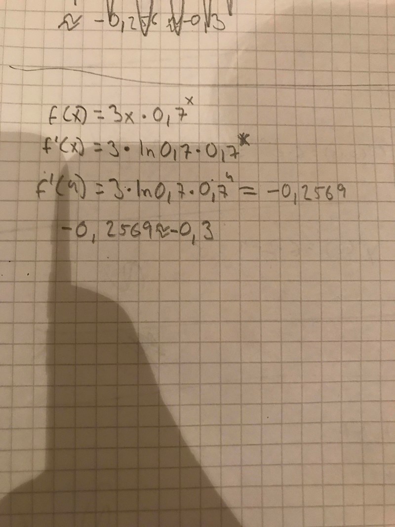 Bestäm ett närmevärde med 2 decimaler till f’(4) då f(x)= 3x • 0.7^x