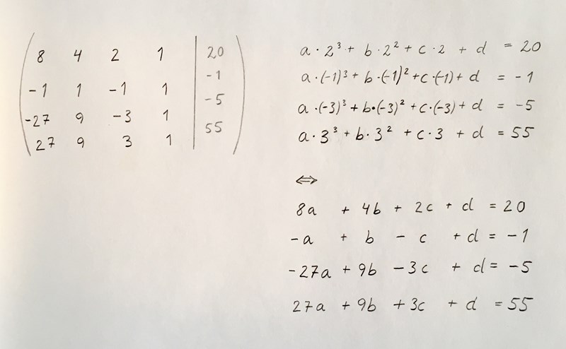 Du kan ju ställa upp fyra ekvationer med hjälp av de fyra kända kombinationerna av x och f(x). Då får du ett ekvationssystem med fyra obekanta. Skriv det i matrisform och lös på vanligt sätt (dvs Gausseliminering)!
