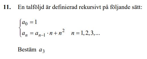 Du har satt in a3= 8 men det ska ju vara n=3 som ska in. Alltså: a3= a2 x 3 + 32=8 x 3 + 9=33