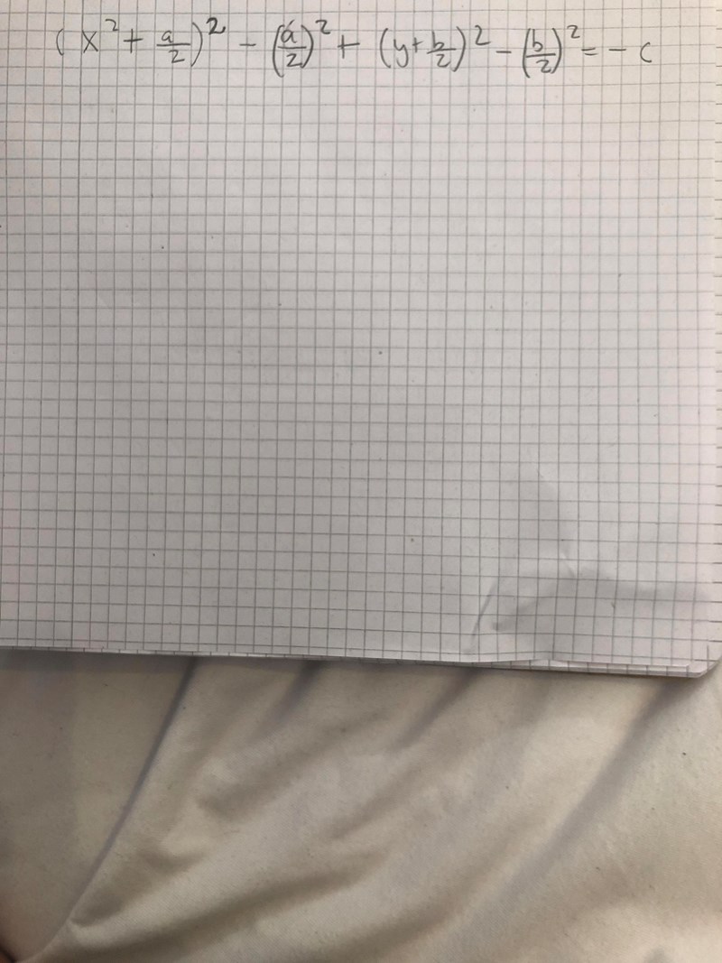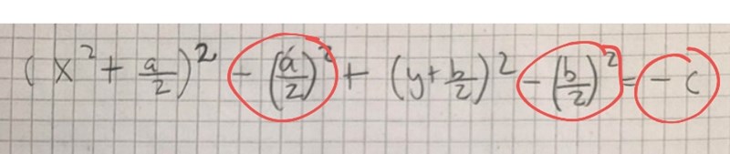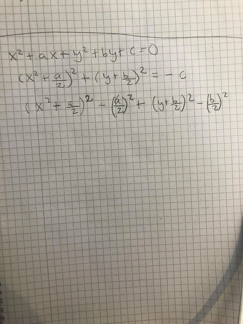 Inte van vid att kvadratkomplettera? Då är det nog bra att öva på enklare exempel först. Hittade den här tråden med samma uppgift som du om du inte lyckas få till det själv: https://www.slader.com/discussion/question/complete-the-squares-in-the-general-equation-x2-ax-y2-by-c-0-and-simplify-the-result-as-much-as-poss/