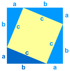 Det finns en matematisk regel (kallas för sats eller teorem) som säger att summan av kateternas kvadrater är lika med kvadraten av hypotenusan. Detta är Pythagoras sats. Det finns många bevis för att satsen är sann. Du kan googla på nätet och hitta bilder som hjälper en (åtminstone mig) att intuitivt förstå vad satsen säger. Se t.ex. bilden nedan