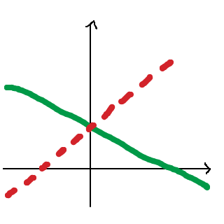 Skärningspunkten mellan den röda (streckade) linjen, som vi söker, och den gröna linjen (som vi har fått) kan vi kalla (a,b). Denna punkt måste uppfylla två krav: