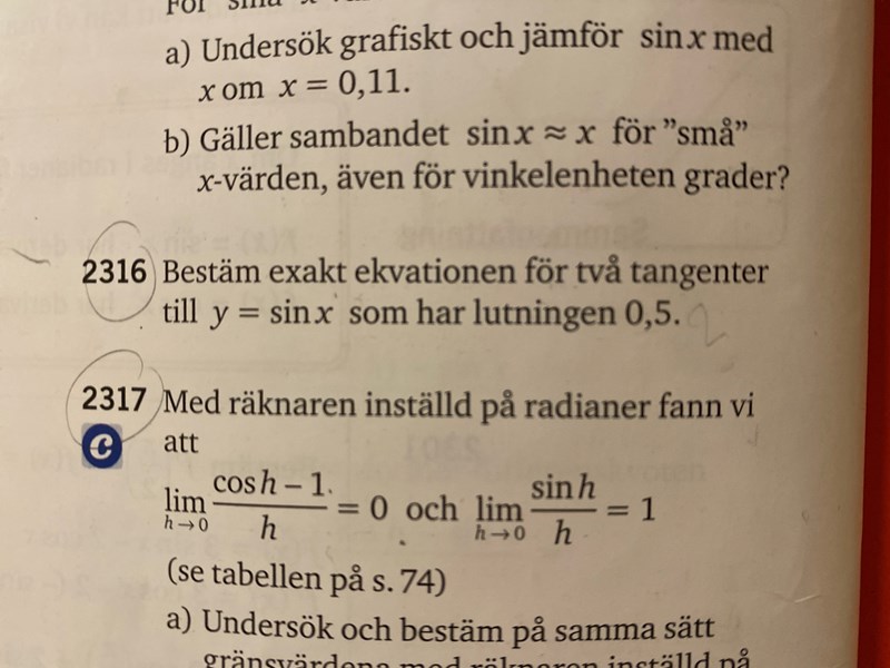 Bestäm exakt ekvationen för två tangenter till y=sin x som har lutningen 0,5