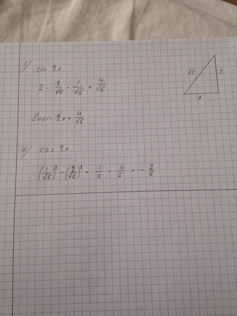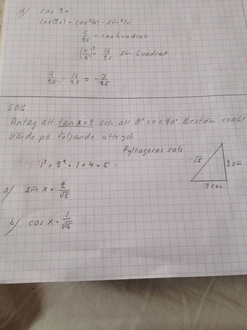Hjärnan kopplade inte ihop det här med tan x = 2. Det var länge sedan som jag körde mycket på pythagoras sats. Det var i A kursen. Grundläggande trigonometri handlar om det här. Jag var inne på dubbla vinkel.