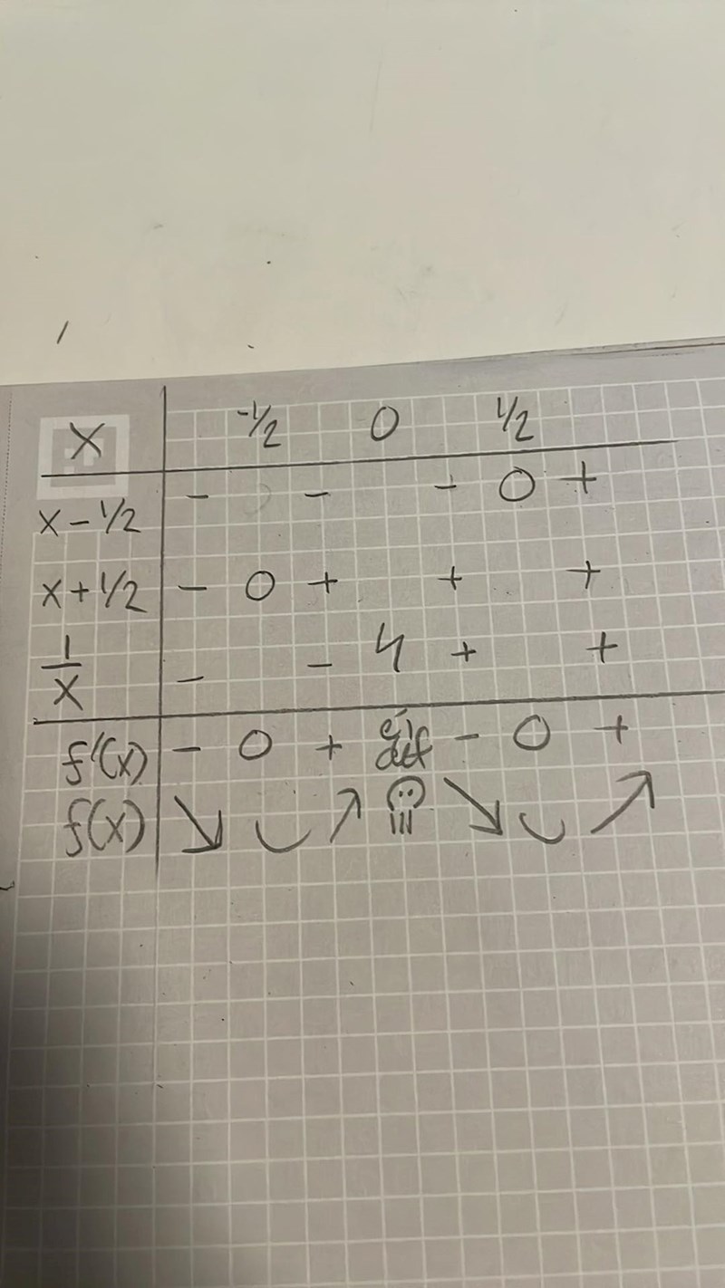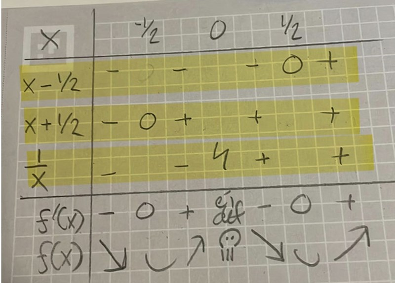 Det är denna summa (eller differens) som du ska utvärdera vid olika värden på x runt den stationära punkten vid x = 1/2, förslagsvis vid x = 1/4, x = 1/2 och x = 1.