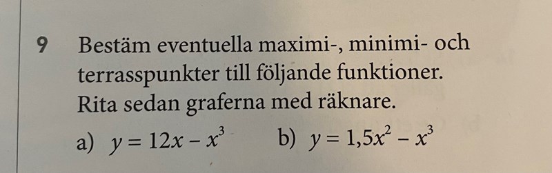 Hur ska du nu göra för att ta reda på vilken typ av extrempunkt det är? Respektive värde för dess punkter. (Om du är osäker så säger de i uppgiften också att använda dig av räknaren för att kontrollera svaret)