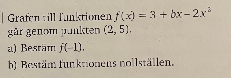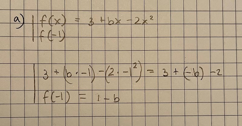 Jag håller på med uppgift a) som du kan se nedan. Jag förstår inte vad för fel jag gör? Jag satte in x = -1 i funktionen 3 + bx -2x2, men ändå så får jag fel svar…Det rätta svaret ska bli f(-1) = -4, men jag förstår inte vart ”b” försvann? Skulle verkligen uppskatta om någon kunde förklara varför min lösning ej fungerar! (Min lösning ser du nedan).