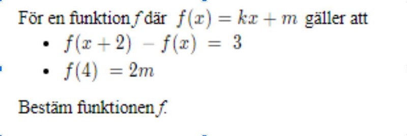 Nu vet vi alltså att f(x) = 1,5x+m och att f(4) = 2m. Kan du använda dig av detta för att beräkna värdet på m?