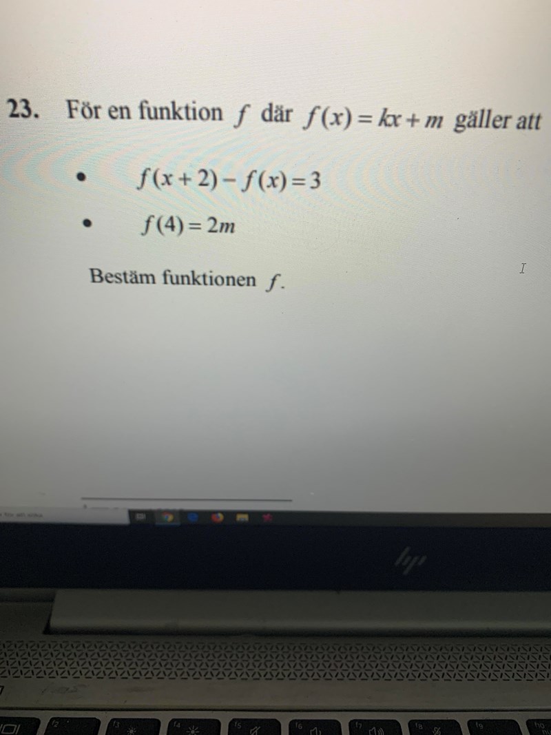 Ekv 1: f(x+2)-f(x)=3. Sätt alltså in x+2 i stället för x i funktionen: k(x+2)+m-(kx+m)=3.