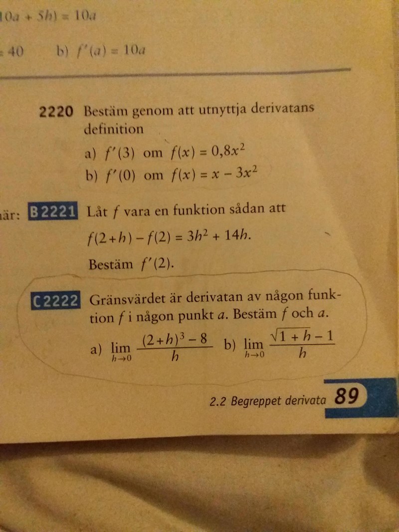 Päivi skrev :Den följer ju mallen mycket bra, eftersom 2^3=8 och att f(x) = 8. f (x) är - 8. Åttorna tar ut varandra och h blir kvar och sedan ska det brytas ut.