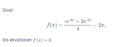 Jag får derivatan att blir e-4x-e-2x-2 men vet ej hur jag ska lösa den när jag sätter den till 0, fastnar där