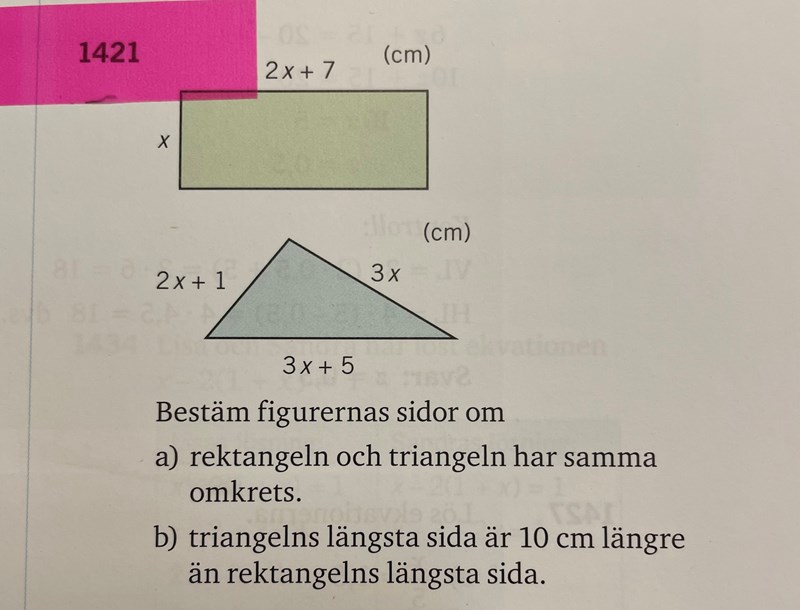 Du vet att triangelns längsta sida är 10 cm längre än rektangelns längsta sida, d v s att 3x+5 = 2x+7+10. Kommer du vidare?