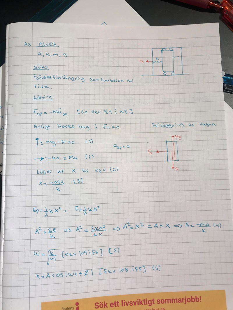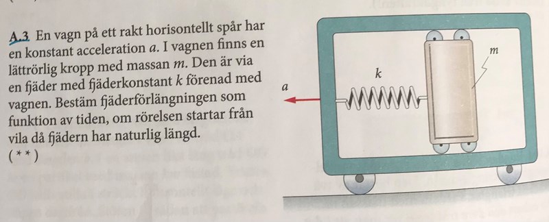 A.3: Du ska frilägga kroppen i vagnens accelererande referenssystem. Du måste införa en tröghetskraft m*a åt höger.