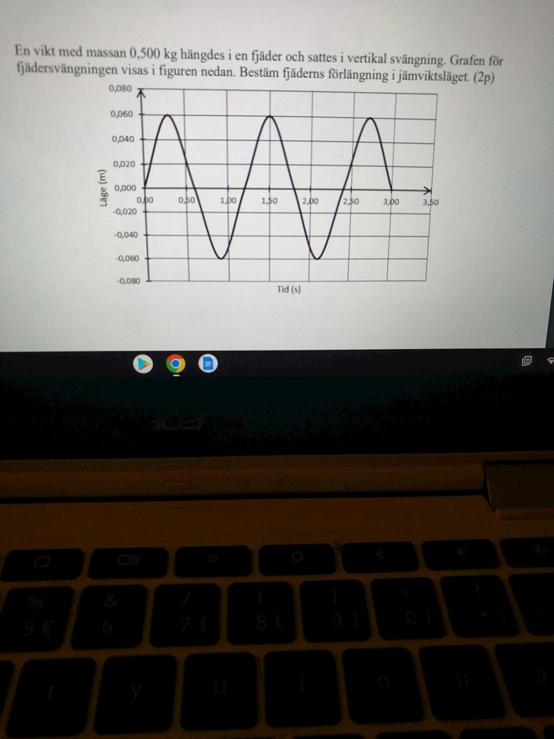 Pieter Kuiper skrev:Mahiya99 skrev:Det är två perioder som jag ser här från 0 till 2,50 sekunder. 2T=2,50 sekunder? Facit säger att det är 2 svängningar och en halv dvs 2T= 3,00 s. I så fall har facit fel. Perioden är 1,20 sekunder.