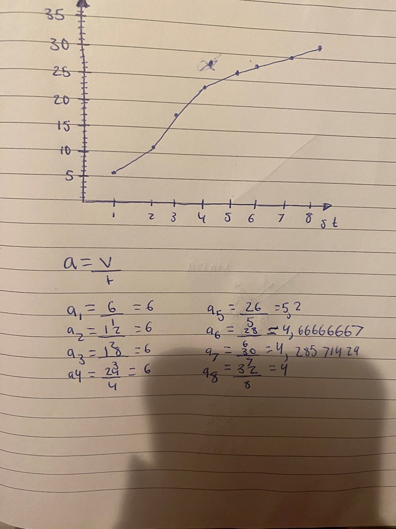 Jag har kommit fram till att det accelerera med 6m/s2 från 1,0 s - 4,0 s. Och att det accelerera med 2m/s2 från 4,0s - 8,0s.