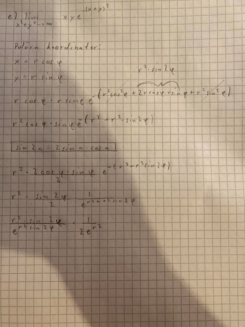 När r går mot ∞ går exponentialfunktionen mycket snabbare mot ∞ än r^2 och uttrycket går mot 0, ifall inte argumentet i exponentialfunktionen är 0, d.v.s sin(2phi) = -1. Då får man kolla på det fallet separat (alltså y = -x) och du bör komma fram till samma ska som vi gjorde tidigare.