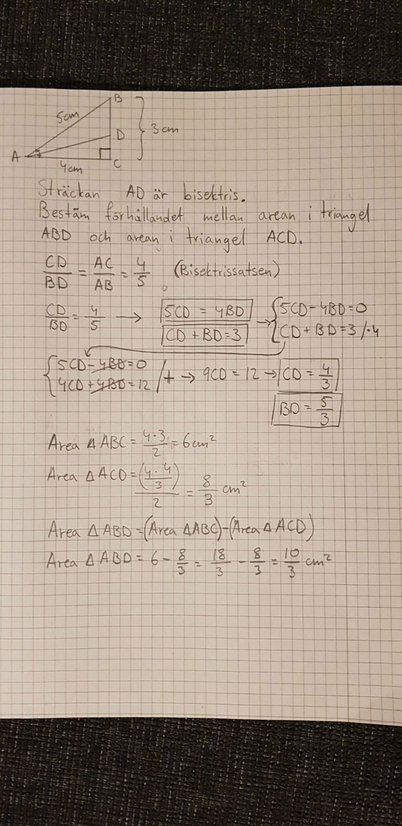 Dessa två sträckor är ju baser i de två trianglarna med samma höjd (4 cm).