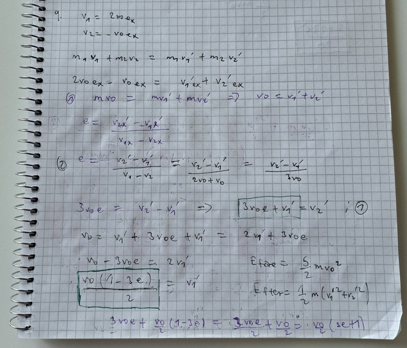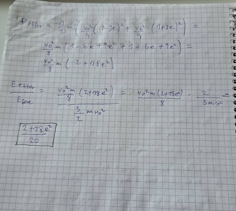 PATENTERAMERA skrev:Utan att gått igenom beräkningarna i detalj så tycker jag att svaret ser rimligt ut. Om e = 1 så borde förhållandet bli ett, vilket stämmer med din formel. Om vi har fullständigt oelastisk kollision, e = 0, så blir förhållandet 1/10 (om jag räknar rätt), vilket även det stämmer med den formel du fått.