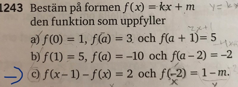 (1): f(x-1)-f(x) = 2 och (2): f(-2) = 1-m. Vi vet också att y = kx+m. Vi sätter in detta i var och en av de båda ekvationerna och får
